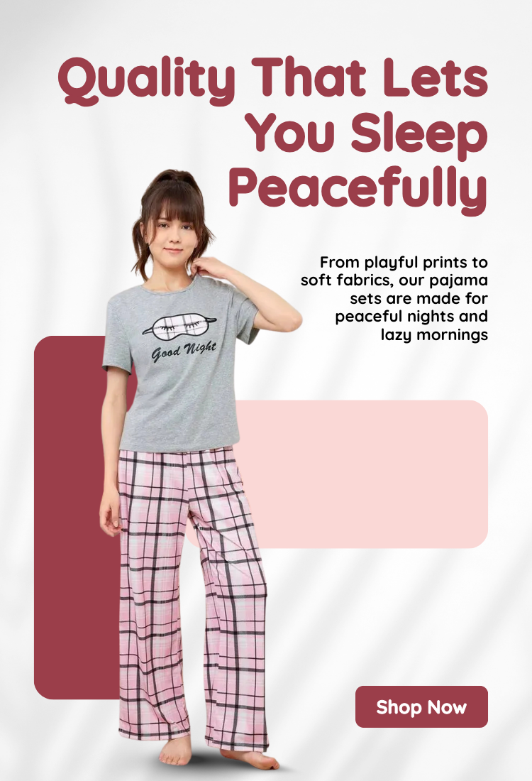 Your nights deserve more than just ordinary pajamas. Our night suits are crafted with breathable fabrics and relaxed fitsβperfect for Netflix binges, morning coffee, and everything in between.