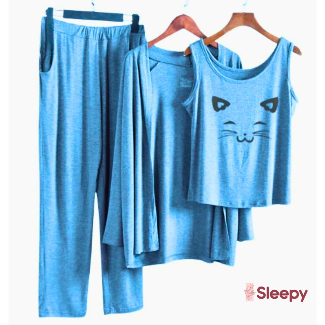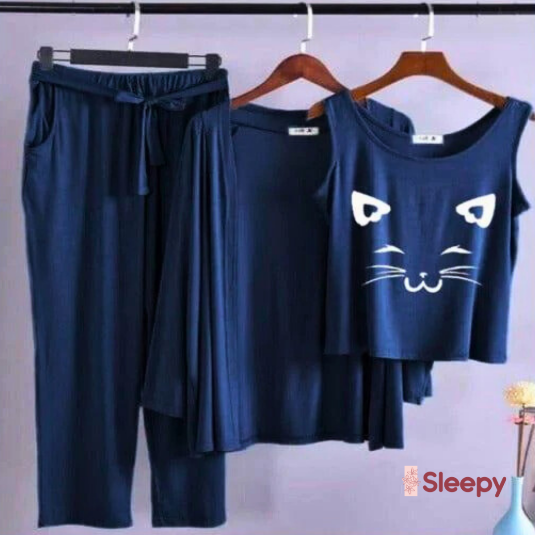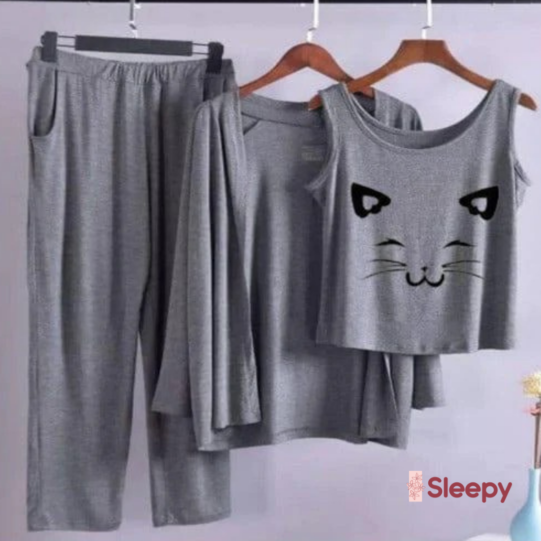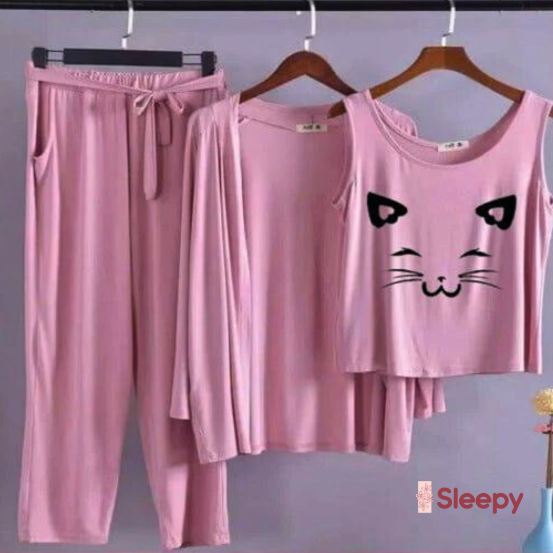 Upgrade your loungewear collection with this stylish 3-piece night suit set, featuring a long-sleeve top, vest, and loose trousers. Designed with comfort and elegance in mind, it’s the perfect choice for cozy nights and relaxed mornings.