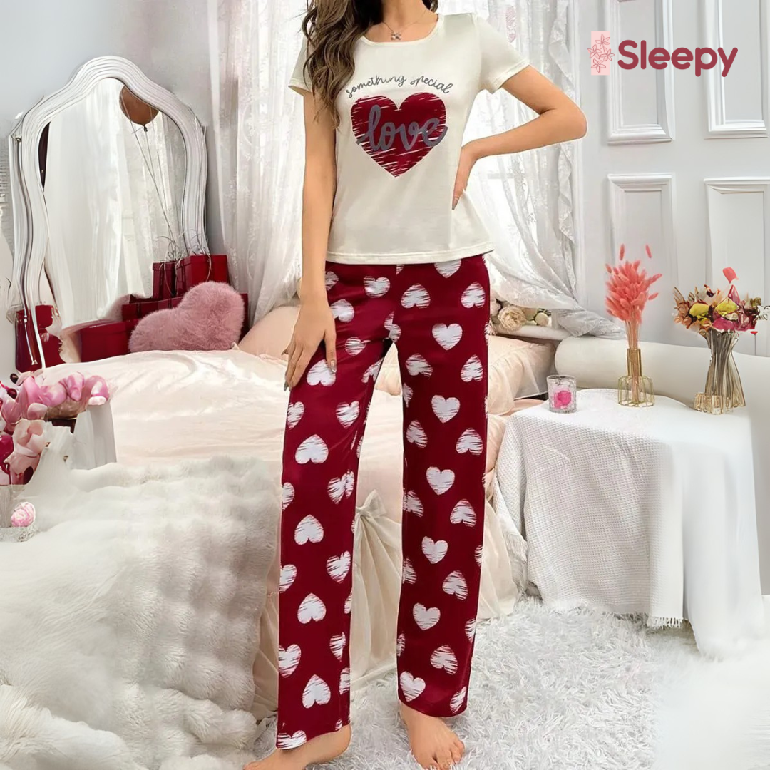 Featuring a soft cream top with a bold red heart and the words "Something Special – Love," paired with deep maroon pajama pants adorned with playful white hearts. This set is the perfect expression of comfort and charm.