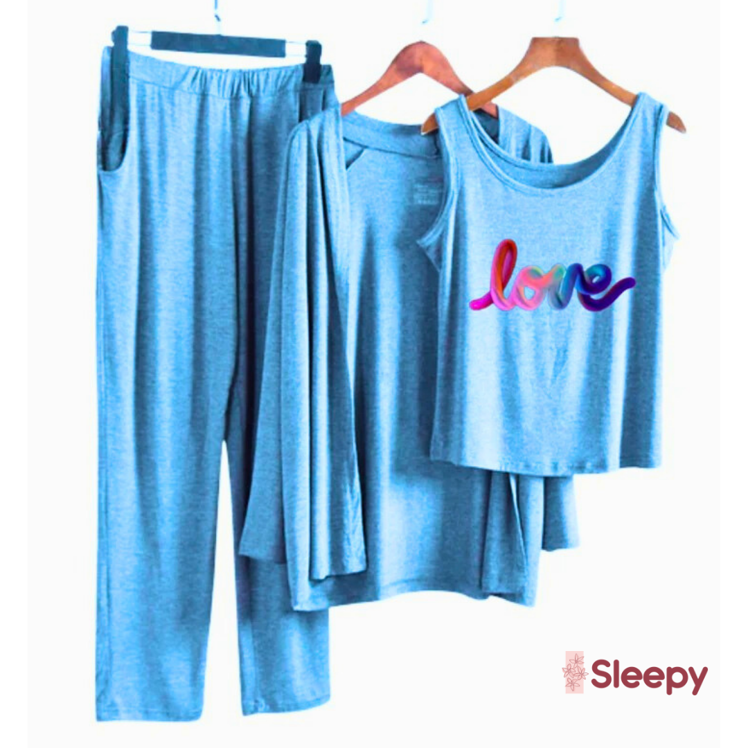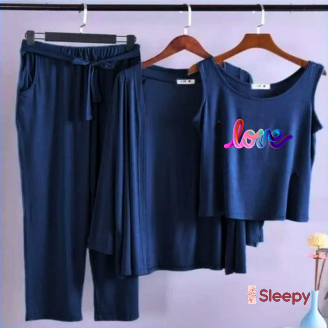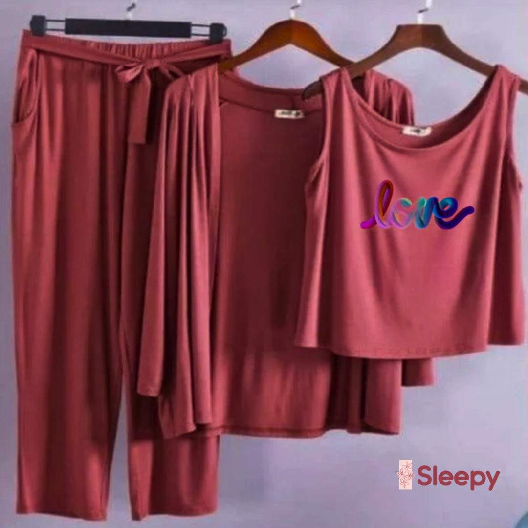 Upgrade your loungewear collection with this stylish 3-piece night suit set, featuring a long-sleeve top, vest, and loose trousers. Designed with comfort and elegance in mind, it’s the perfect choice for cozy nights and relaxed mornings.