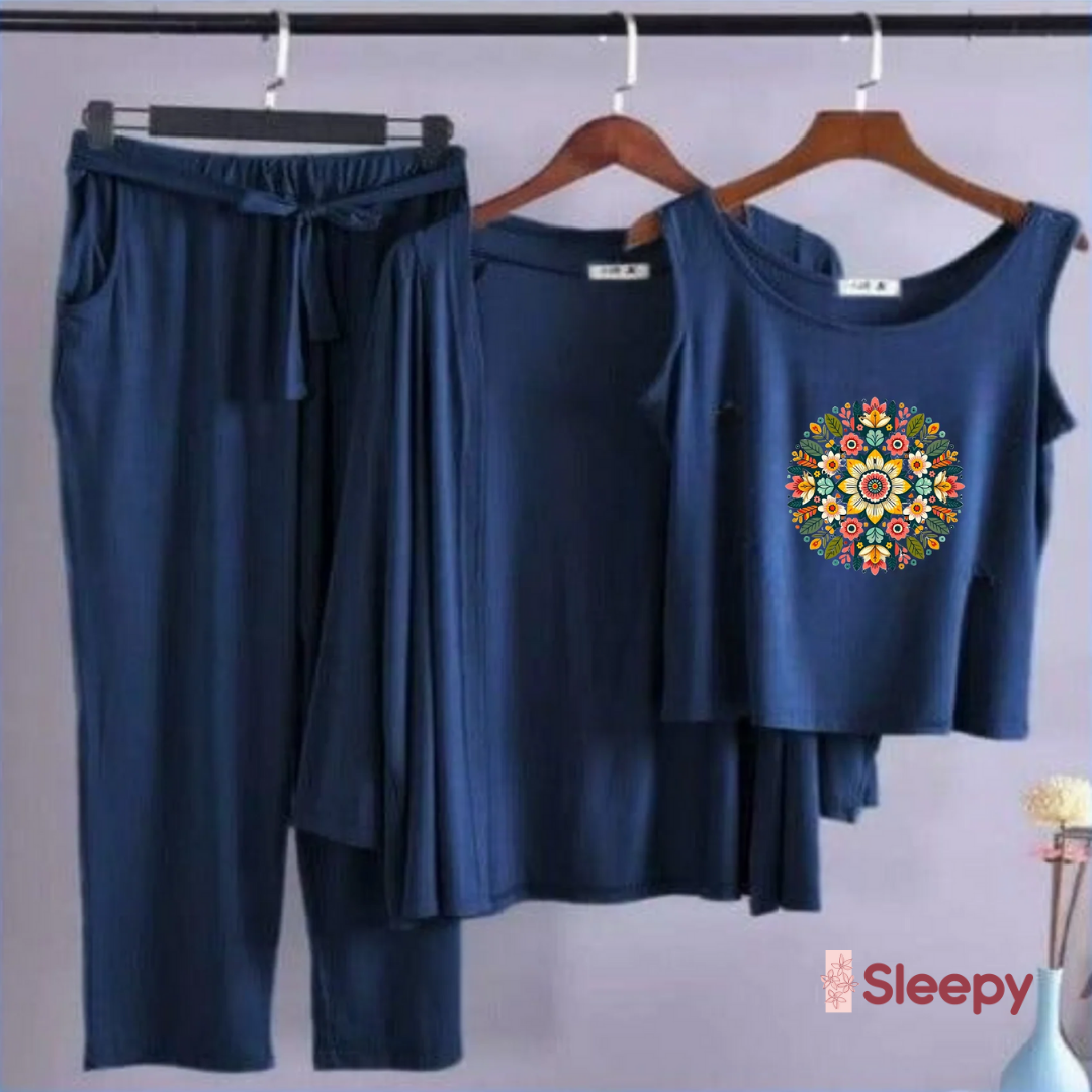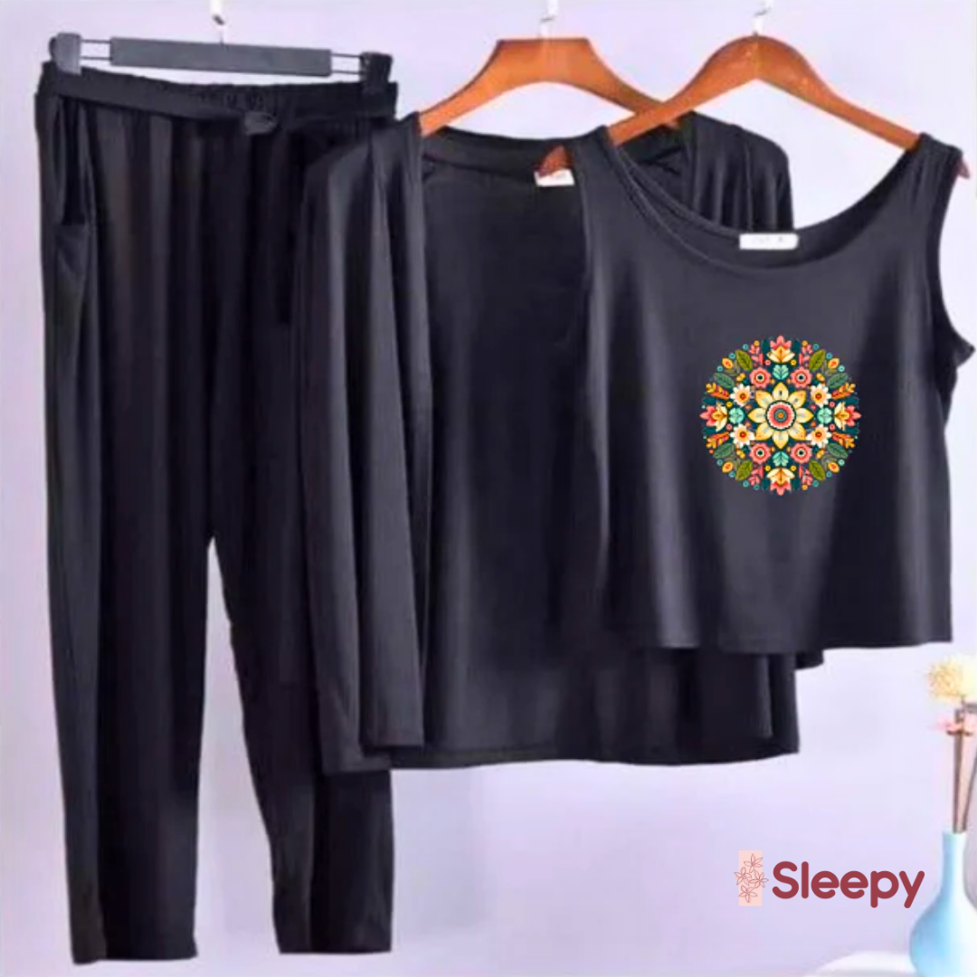 Upgrade your loungewear collection with this stylish 3-piece night suit set, featuring a long-sleeve top, vest, and loose trousers. Designed with comfort and elegance in mind, it’s the perfect choice for cozy nights and relaxed mornings.